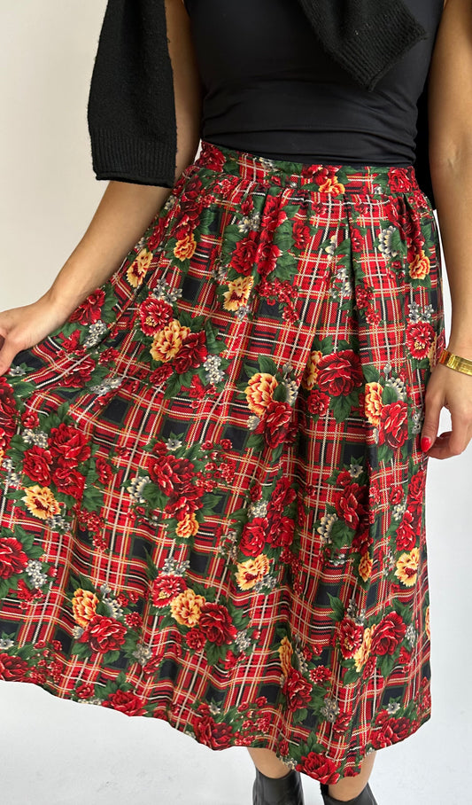 1990's Vintage Red Plaid Maxi Skirt with Flowers