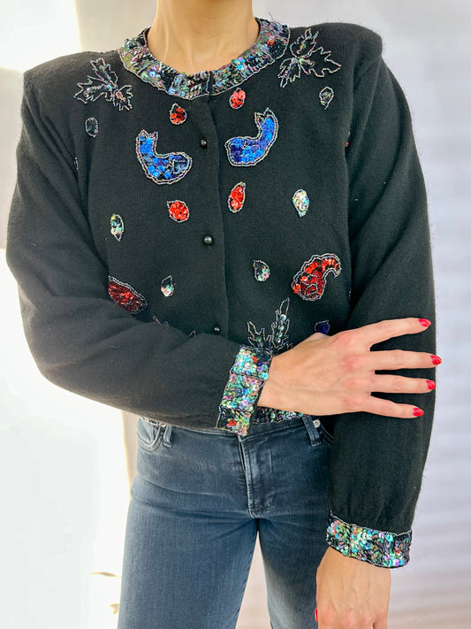 1960s Vintage Wool Blend Black Cardigan with sequins and beading