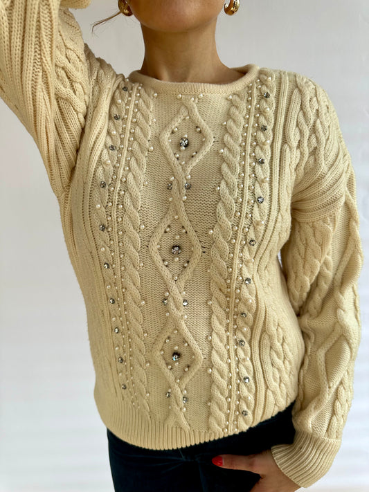 1990’s Vintage Escada Rhinestone & Pearl Cableknit Wool Sweater