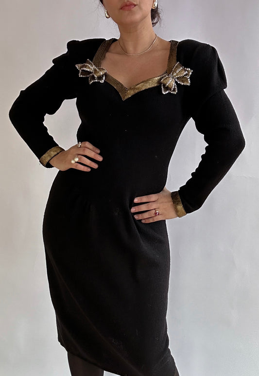 1980s Vintage Black Knit Party Dress with Gold Sequin Bows