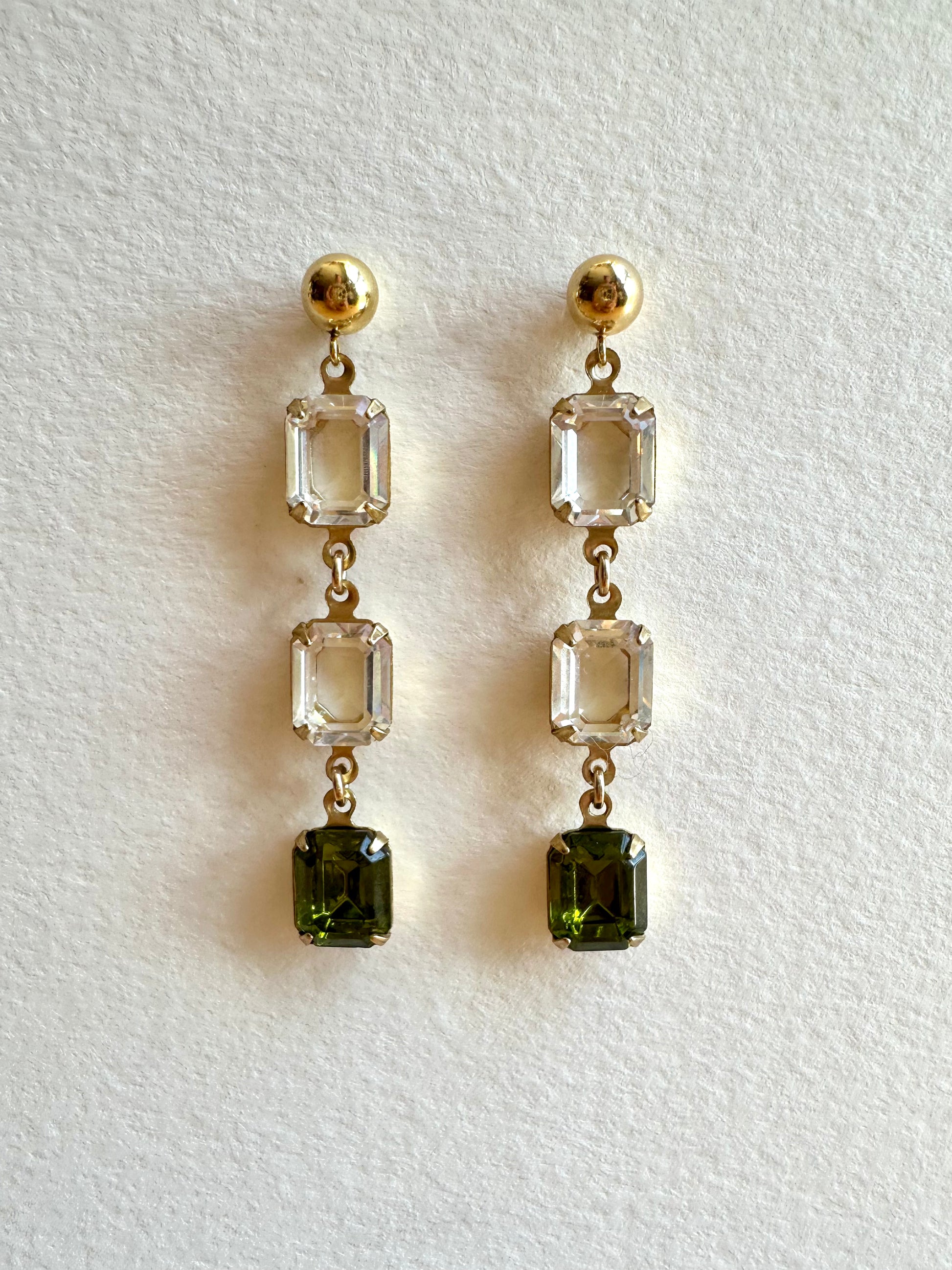 These glamorous handmade earrings feature 14k gold-filled studs with vintage glass charms set in brass casings.