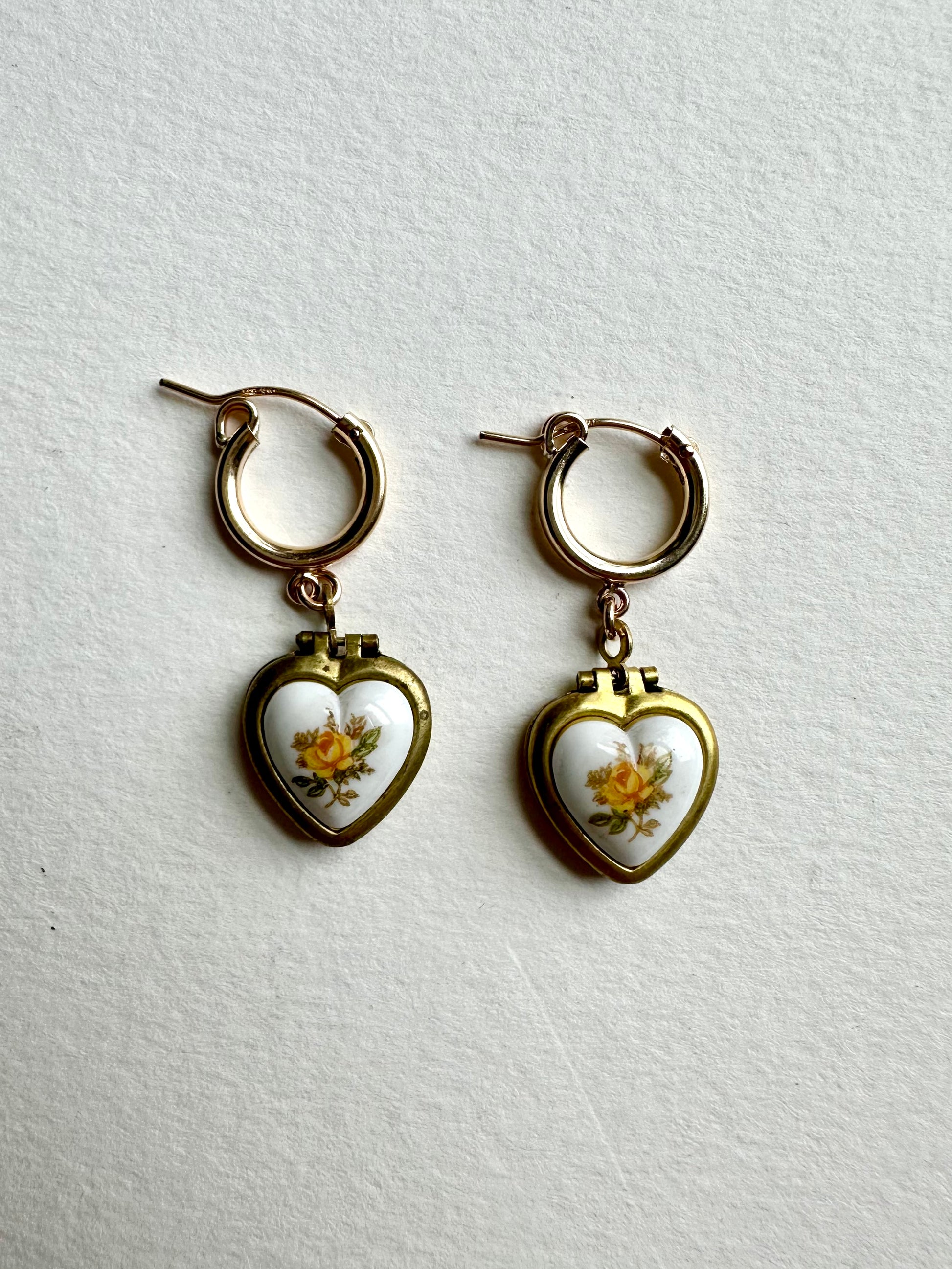 These earrings feature 14k gold filled huggie hoops and vintage brass heart lockets with yellow hand painted cabochons. Lockets are working and ready to be filled with photos!