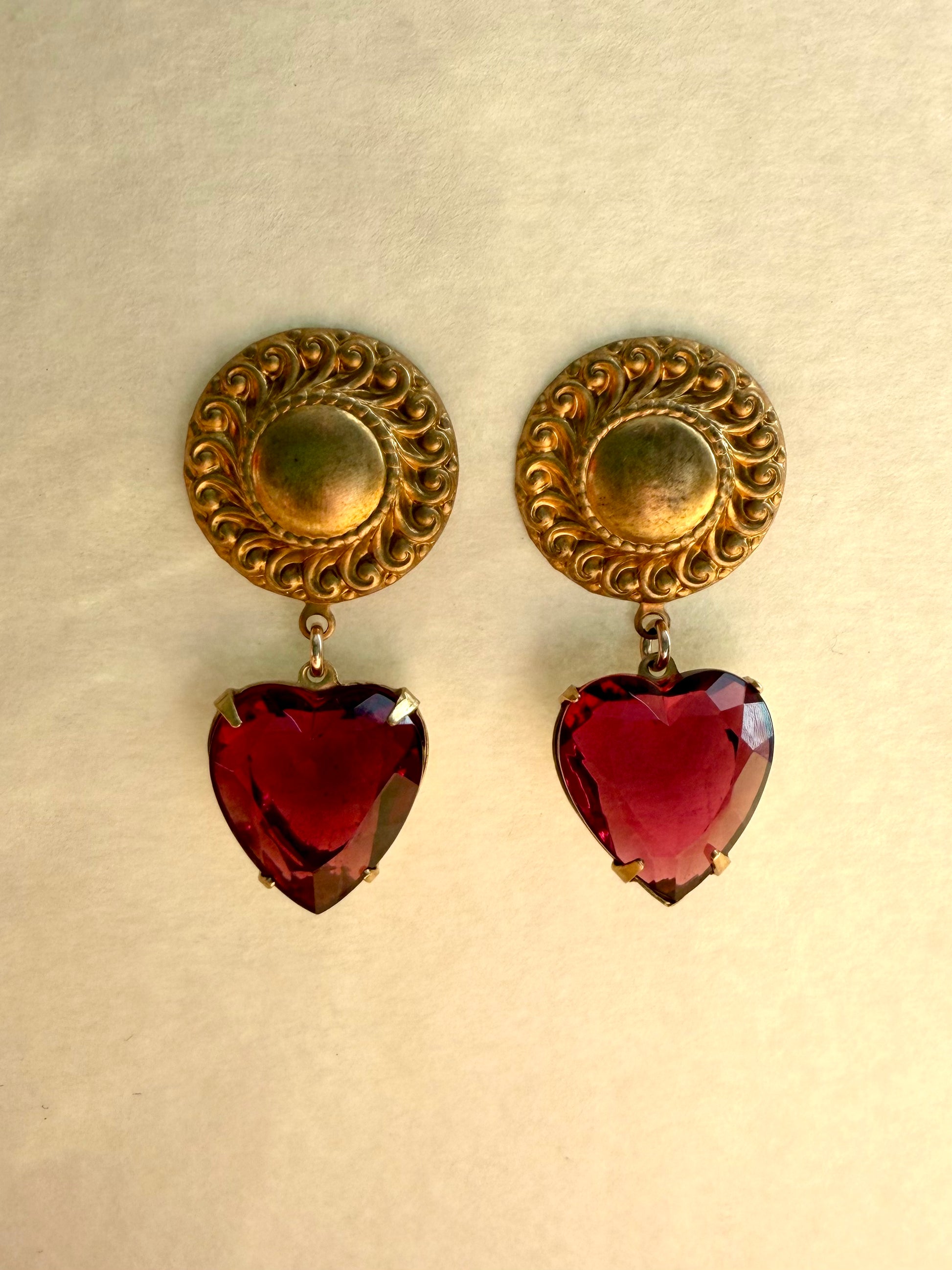 The Esme earrings feature ornate vintage brass bases and red glass heart charms set in brass.