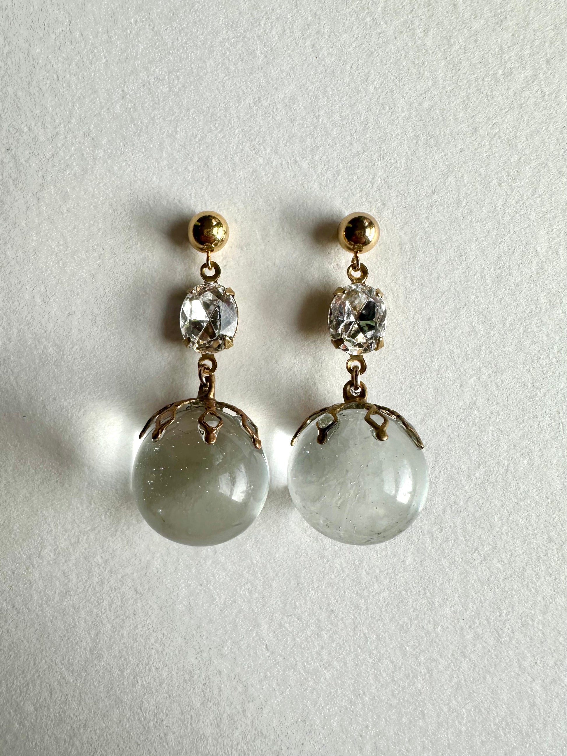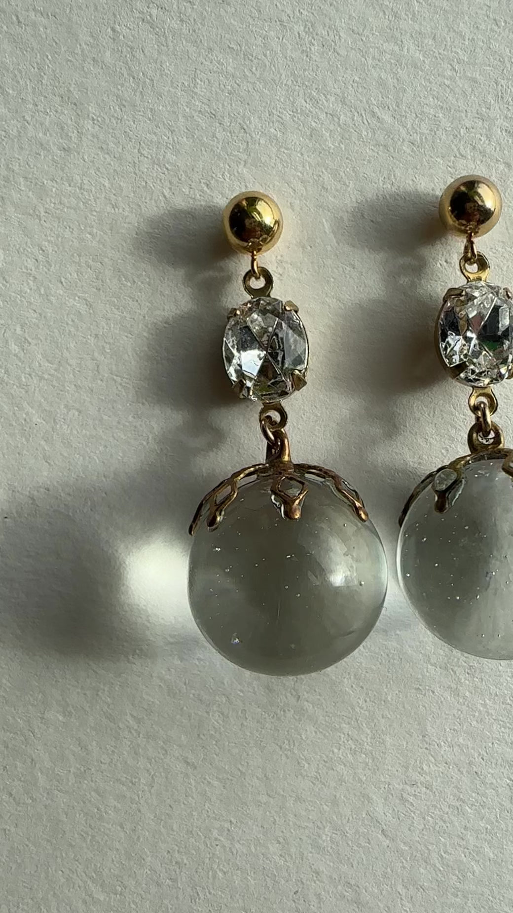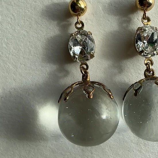 These glamorous handmade earrings feature 14k gold-filled studs with vintage glass rhinestones set in brass and clear glass balls.