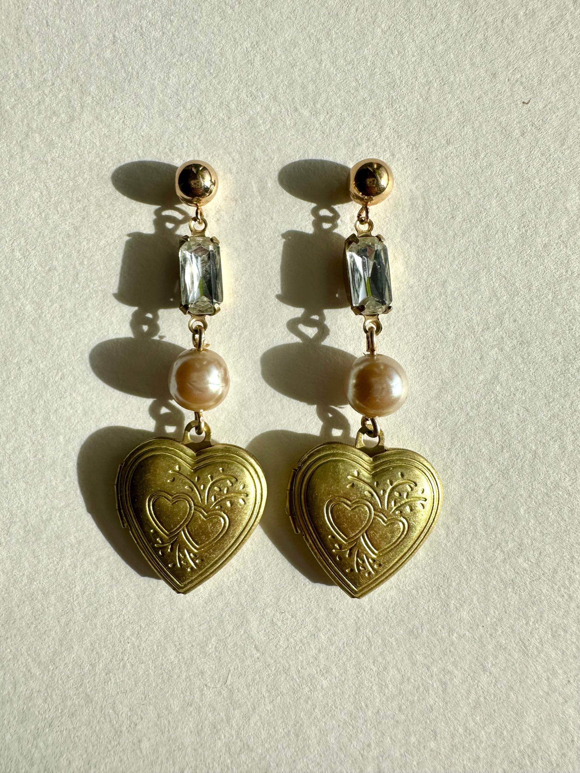 These glamorous handmade earrings feature 14k gold-filled studs with vintage glass rhinestones set in brass, faux pearls, and vintage brass heart lockets.