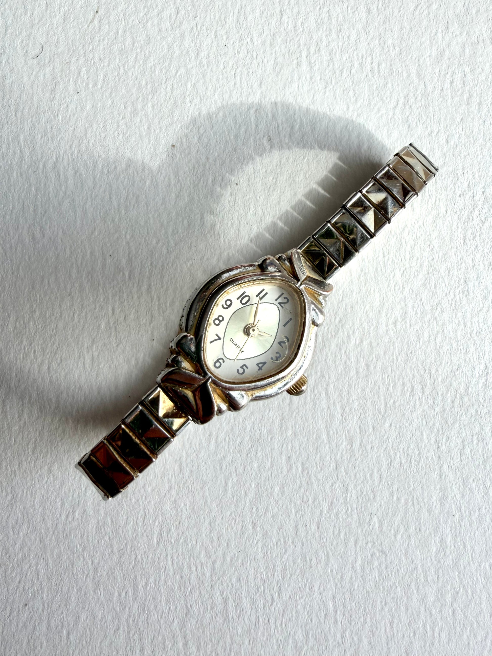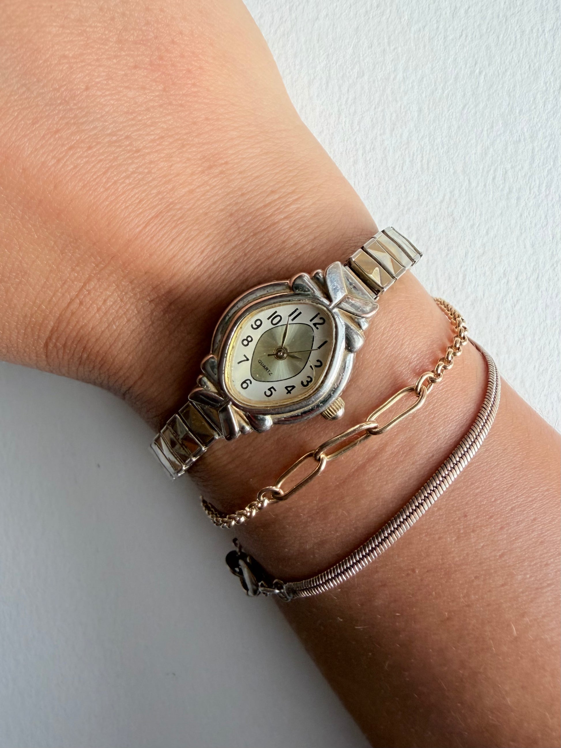 A beautiful vintage two toned unnamed watch with chevron strap. This watch features a white and silver face with black numerals. The band is stretchy and has one slight imperfection that isn't noticeable when worn. The glass face also has a small scratch